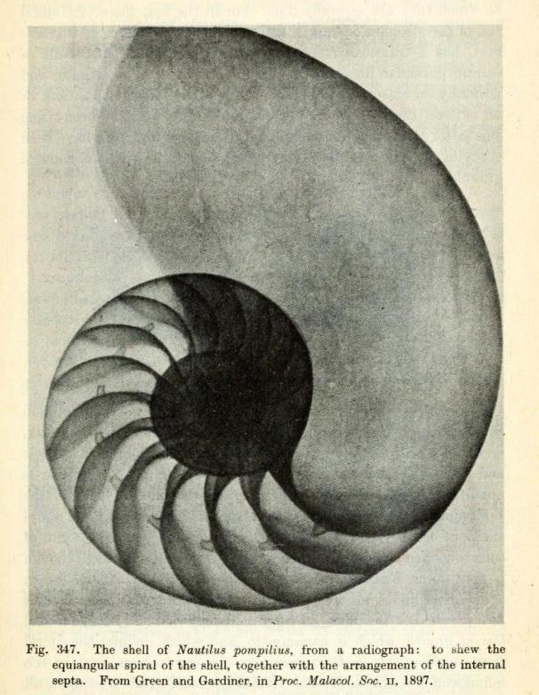 Take the nautilus shell, which grows outward without changing form, adding new chambers in a logarithmic spiral that maintains proportion throughout development. This isn't just beautiful—it's functional. The spiral allows for expansion while maintaining structural integrity and using minimal materials.